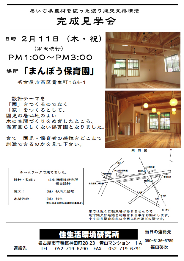 今までも住宅では、地域材(あいちの木)を使うことは当り前のようにして提案していますが、非住宅でそれも保育園を木構造とすることはありませんでした、・・・福祉施設の内部を木装化することはいくつもありま…