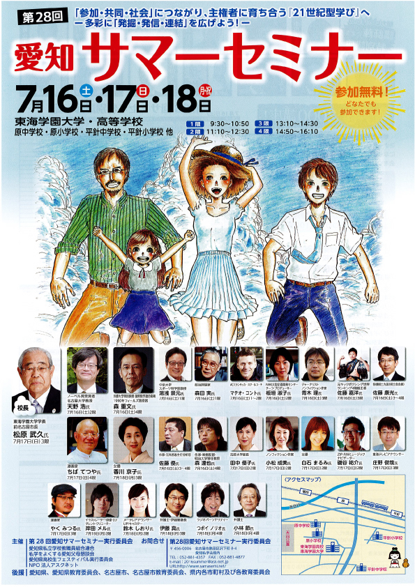 毎年、愛知県内の私学通う高校生や、その親、そして教師が取り組んでいる市民講座「愛知サマーセミナー」が、今年は天白区の東海学園高校・大学をメイン会場とし近隣の小中学をも会場として、7月16(土)~18…