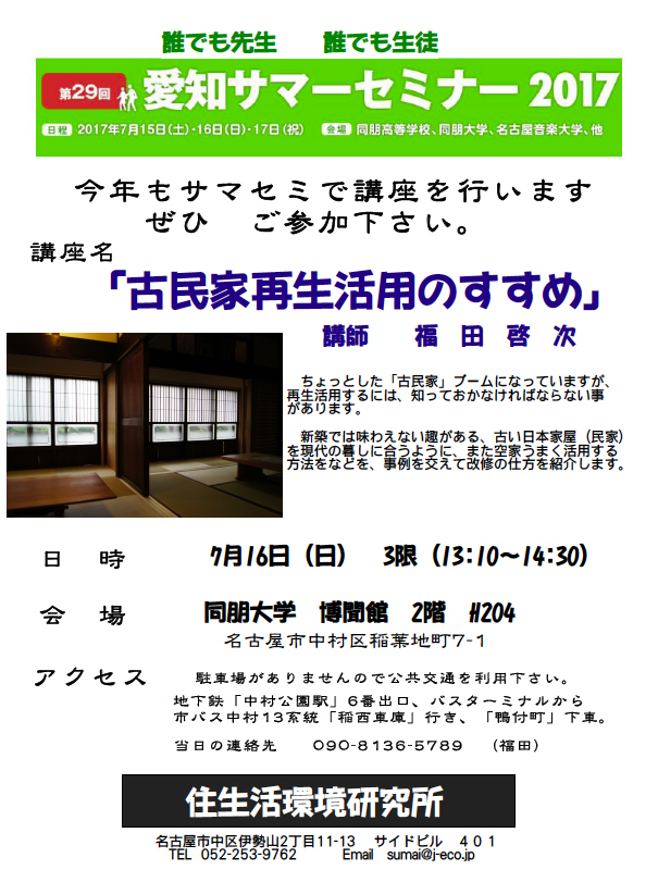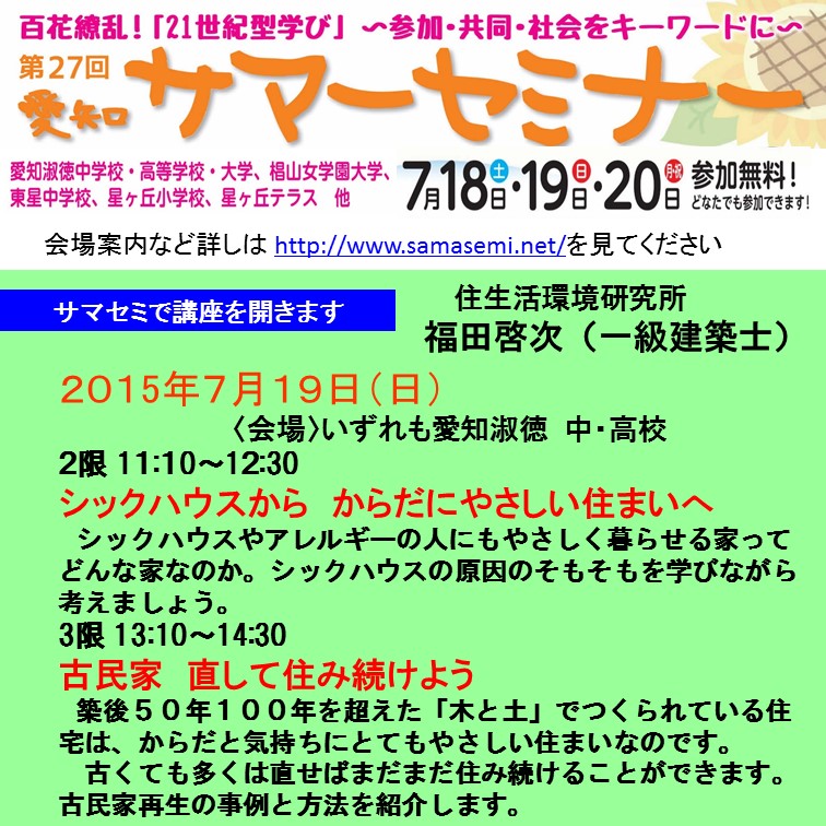 毎年この時期になるとお知らせをしていていますが、今年も愛知サマーセミナーで2つの講座を開きます。一つは「シックハウス・アレルギーにやさしい住まい」そして「古民家再生活用のすすめ」で、いずれも7月1…
